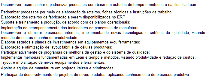 Responsável pelo desenvolvimento dos processos produtivos e por toda documentação técnica. Promove suporte técnico a equipe de manufatura. Responsável por estabelecer melhoria continua nos processo de fabricação.